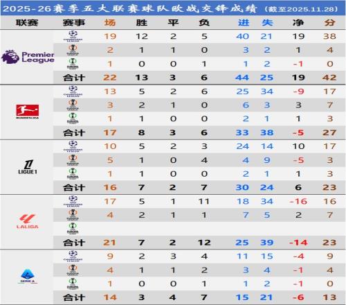 这是欧冠欧联第五轮(欧协联第四轮)结束后,五大联赛球队的整体成绩: