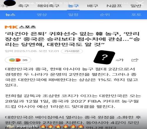 在主场大胜中国男篮后,韩国队的前锋李贤重转发了此前韩国媒体写的,韩国队很难击败中国男篮的新闻,似乎早就憋了一口气。 李贤重之前基本上没有更新过自己的社交媒体,但是在击败中国男篮后,他立马将之前韩国媒体报道的,韩国队很难战胜中国男篮的新闻截图上传,还打上了一个大大的问号。